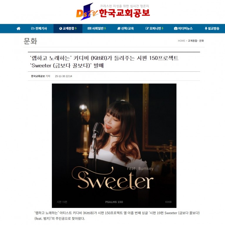 [기사] ‘랩하고 노래하는’ 키디비 (KittiB)가 들려주는 시편 150프로젝트 ‘Sweeter (금보다 꿀보다)’ 발매(한국교회공보)