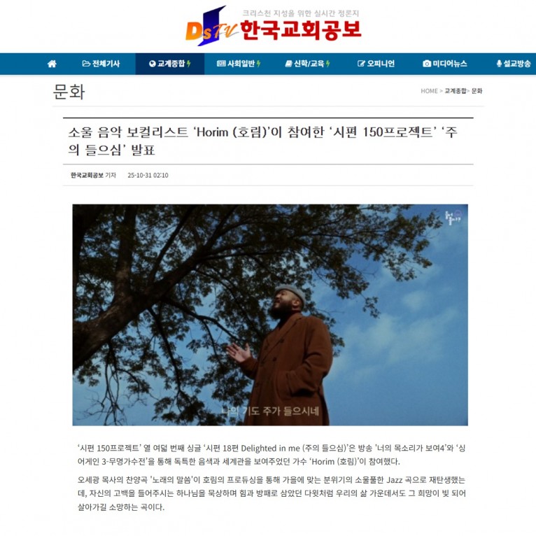 뮤직타임 [기사] 소울 음악 보컬리스트 ‘Horim (호림)’이 참여한 ‘시편 150프로젝트’ ‘주의 들으심’ 발표(한국교회공보)