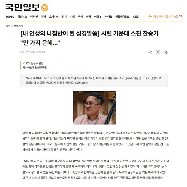 뮤직타임 [기사] 김성수, [내 인생의 나침반이 된 성경말씀] 시련 가운데 스친 찬송가 “만 가지 은혜…”(국민일보)