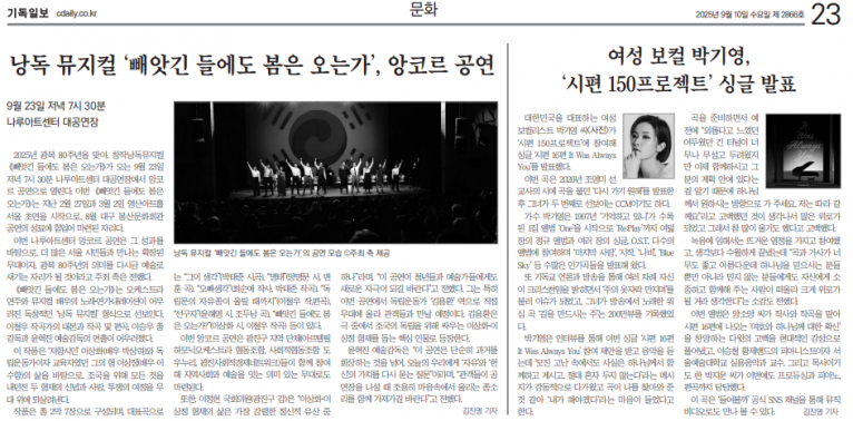 뮤직타임 [기사] 여성 보컬 박기영, ‘시편 150프로젝트’ 싱글 발표(기독일보)