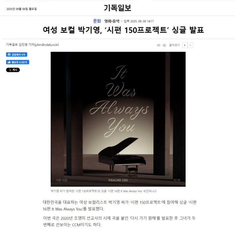 [기사] 여성 보컬 박기영, ‘시편 150프로젝트’ 싱글 발표(기독일보)