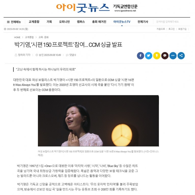 [기사] 박기영, ‘시편 150 프로젝트’ 참여… CCM 싱글 발표(아이굿뉴스 기독교연합신문)