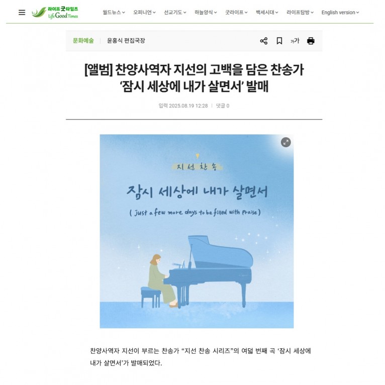 [기사] 찬양사역자 지선의 고백을 담은 찬송가 ‘잠시 세상에 내가 살면서’ 발매(라이프굿타임즈)