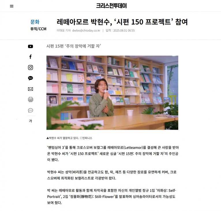 [기사] 레떼아모르 박현수, ‘시편 150 프로젝트’ 참여(크리스천투데이)