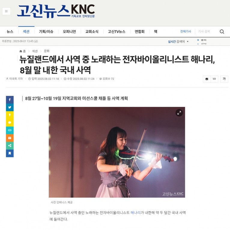 뮤직타임 [기사] 뉴질랜드에서 사역 중 노래하는 전자바이올리니스트 해나리, 8월 말 내한 국내 사역(고신뉴스 KNC)
