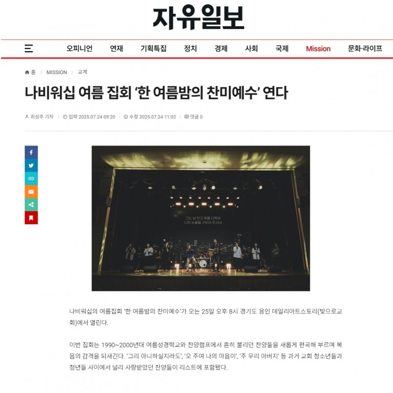 [기사] 나비워십 여름 집회 ‘한 여름밤의 찬미예수’ 연다(자유일보)