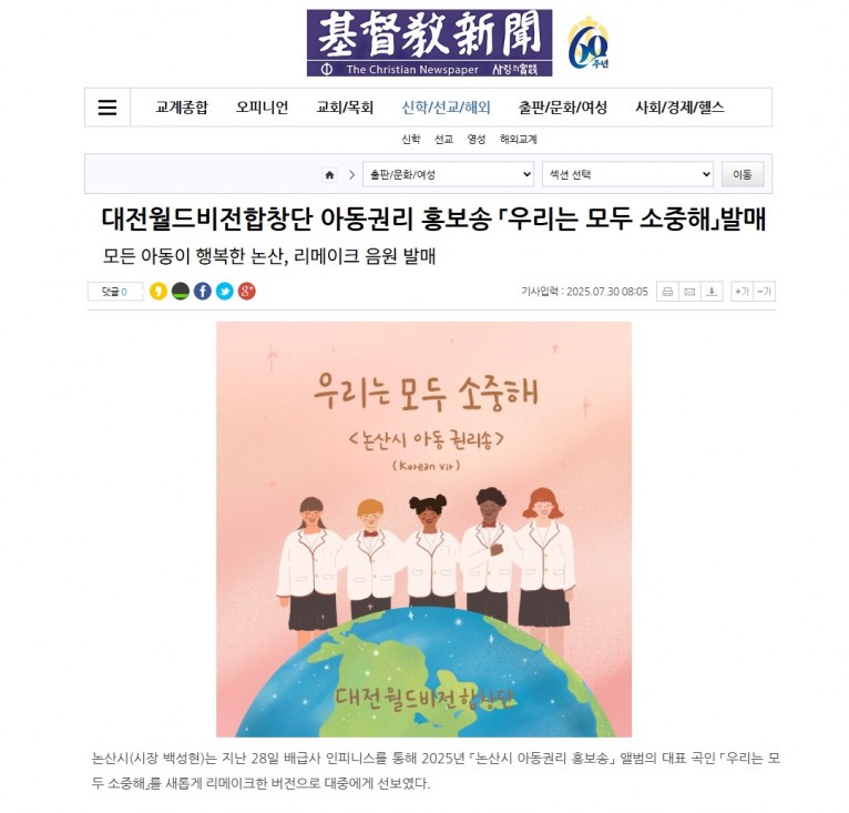 뮤직타임 [기사] 대전월드비전합창단 아동권리 홍보송 「우리는 모두 소중해」발매(기독교신문)