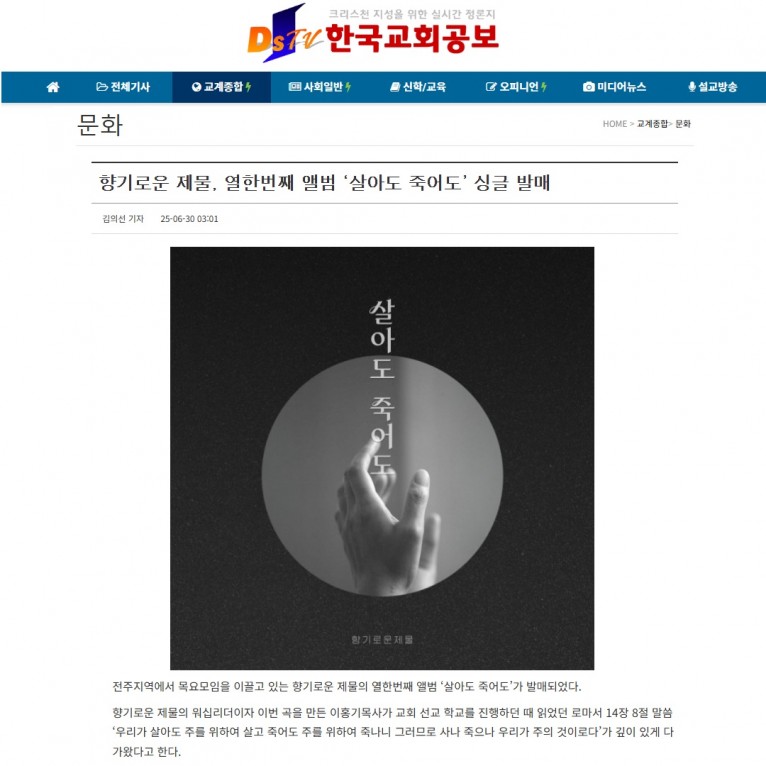 [기사] 향기로운 제물, 열한번째 앨범 ‘살아도 죽어도’ 싱글 발매(한국교회공보)
