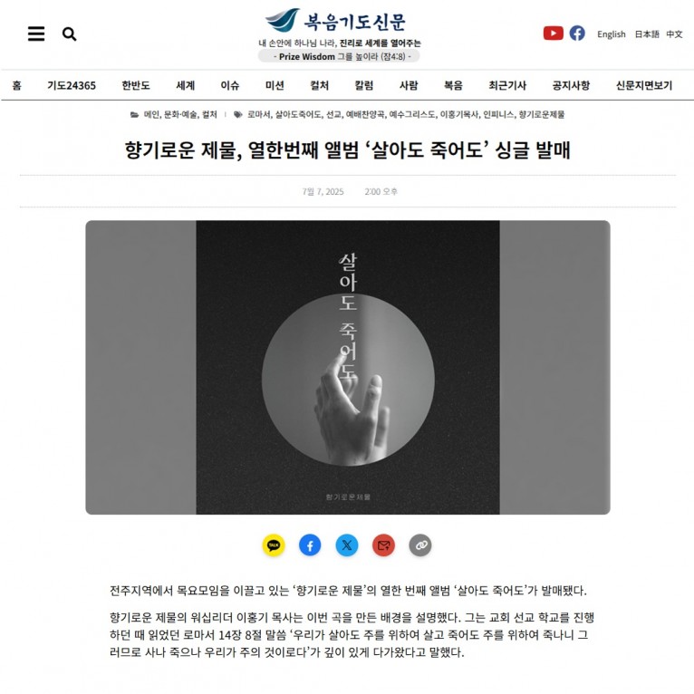 [기사] 향기로운 제물, 열한번째 앨범 ‘살아도 죽어도’ 싱글 발매(복음기도신문)