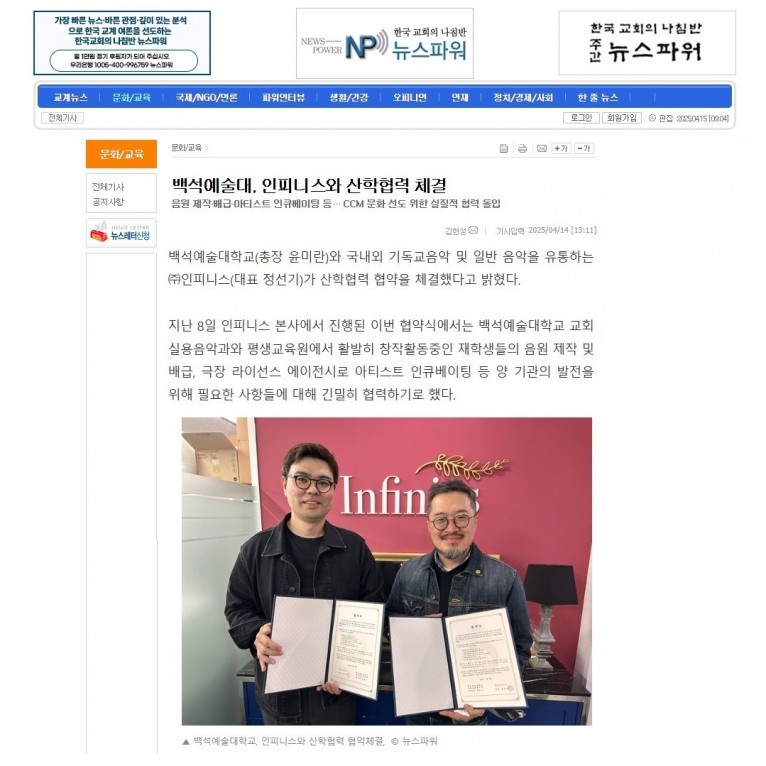 뮤직타임 [기사] 백석예술대, 인피니스와 산학협력 체결(뉴스파워)
