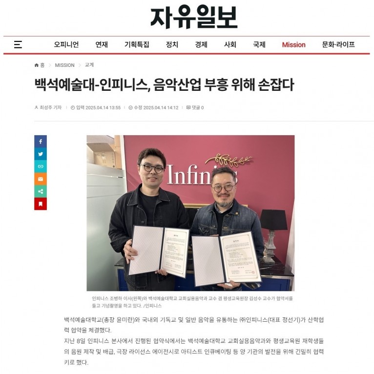 뮤직타임 [기사] 백석예술대-인피니스, 음악산업 부흥 위해 손잡다(자유일보)