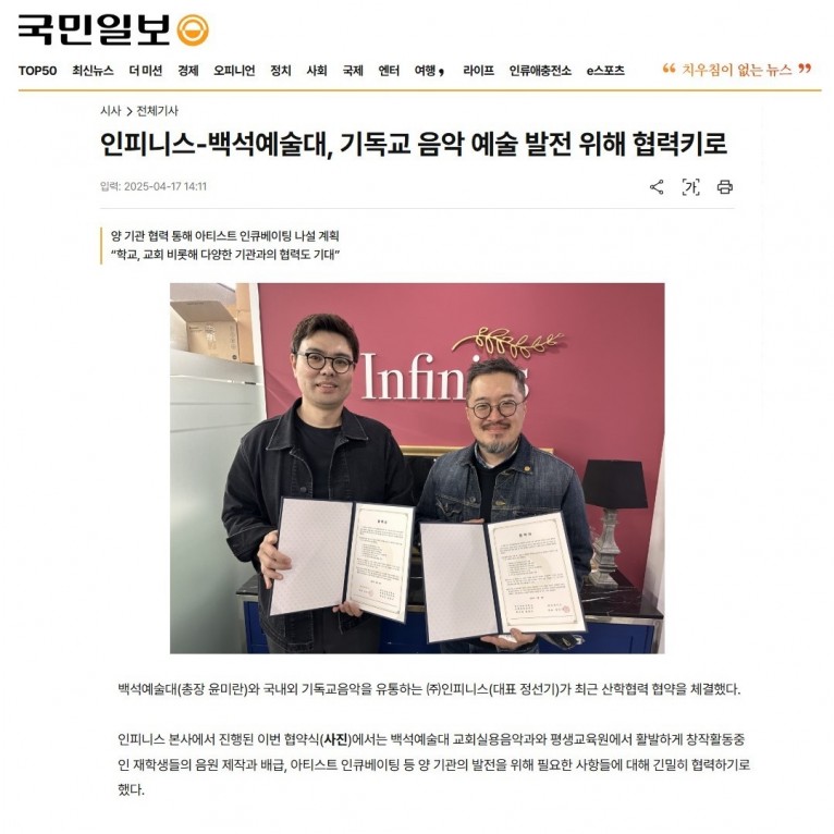 [기사] 인피니스-백석예술대, 기독교 음악 예술 발전 위해 협력키로(국민일보)