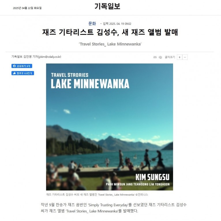 작년 9월 찬송가 재즈 음반인 ‘Simply Trusting Everyday’를 선보였던 재즈 기타리스트 김성수 씨가 재즈 앨범 ‘Travel Stories_ Lake Minnewanka’를 발매했다.