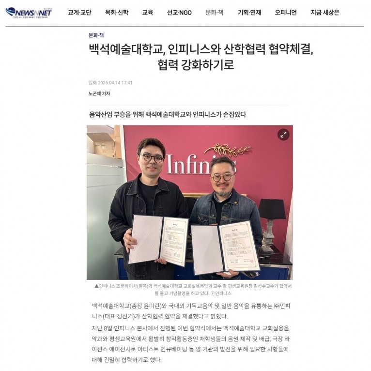 뮤직타임 [기사] 백석예술대학교, 인피니스와 산학협력 협약체결, 협력 강화하기로(뉴스앤넷)