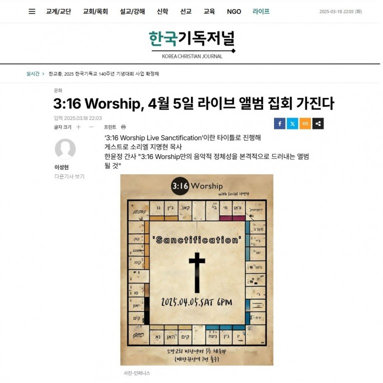 [기사] 3:16 Worship, 4월 5일 라이브 앨범 집회 가진다(한국기독저널)