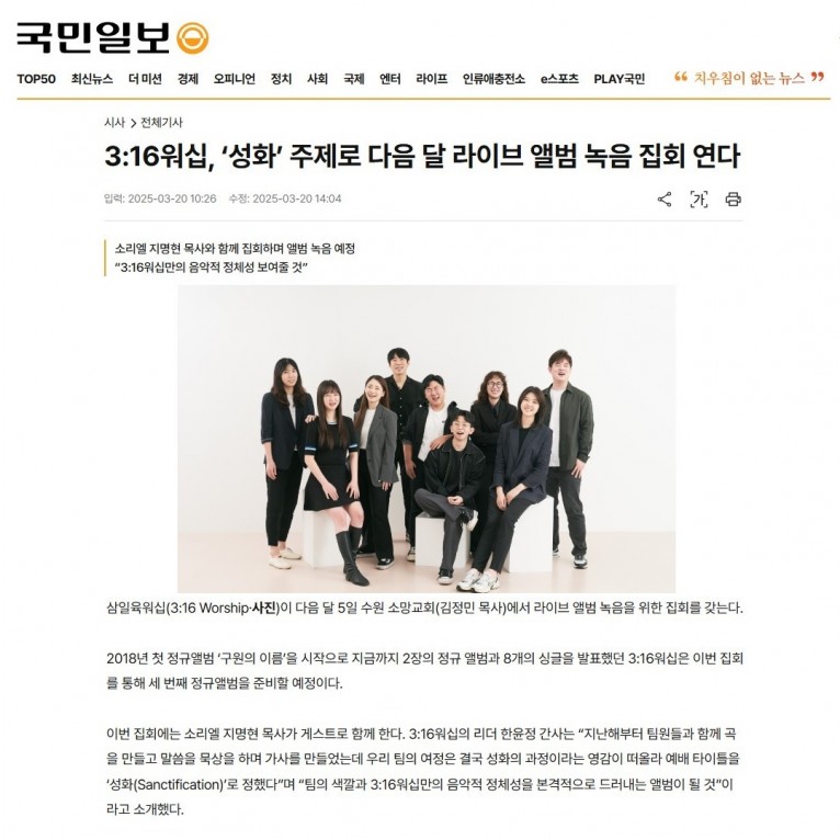뮤직타임 [기사] 3:16워십, ‘성화’ 주제로 다음 달 라이브 앨범 녹음 집회 연다(국민일보)