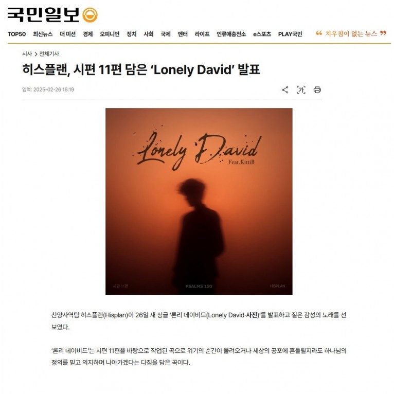 [기사] 히스플랜, 시편 11편 담은 ‘Lonely David’ 발표(국민일보)