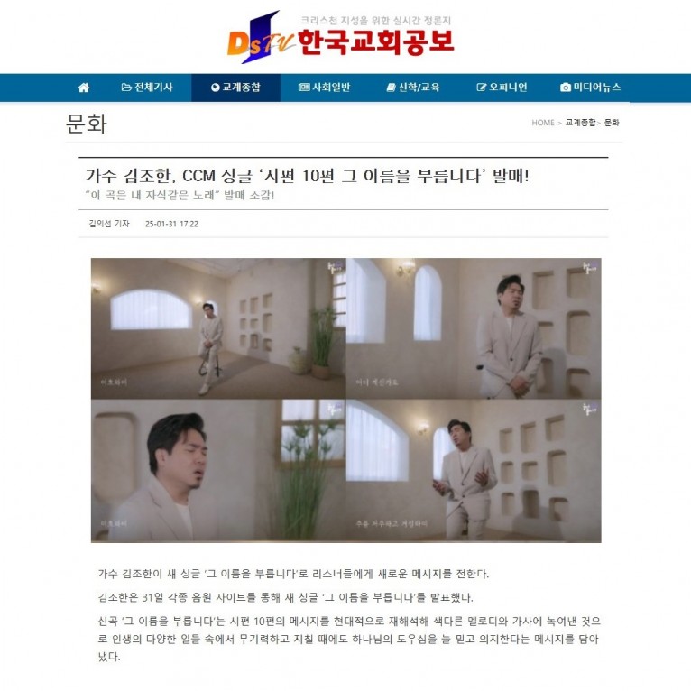 [기사] 가수 김조한, CCM 싱글 ‘시편 10편 그 이름을 부릅니다’ 발매!(한국교회공보)