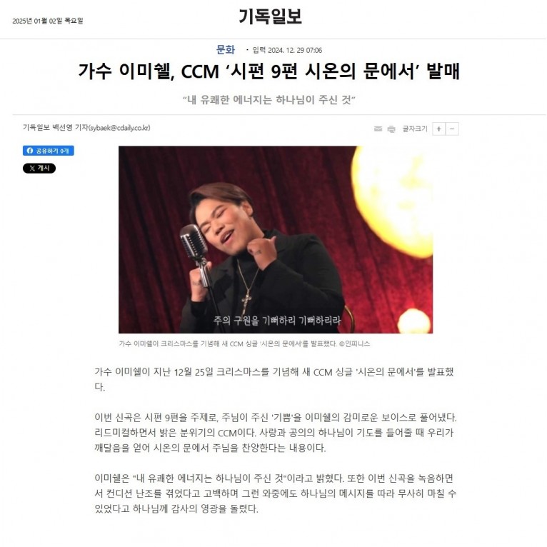 뮤직타임 [기사] 가수 이미쉘, CCM ‘시편 9편 시온의 문에서’ 발매(기독일보)