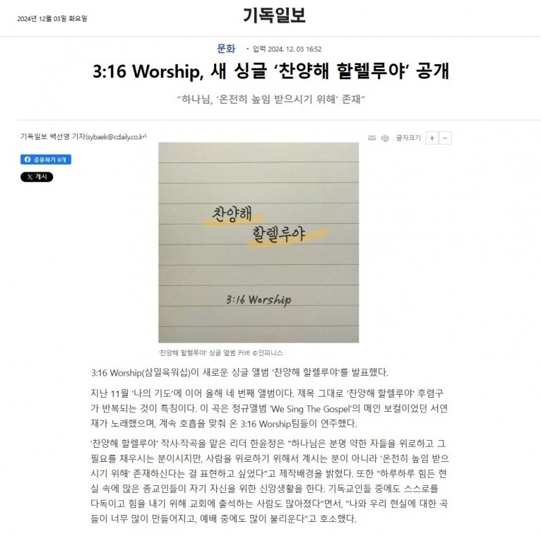 뮤직타임 [기사] 3:16 Worship, 새 싱글 ‘찬양해 할렐루야’ 공개(기독일보)