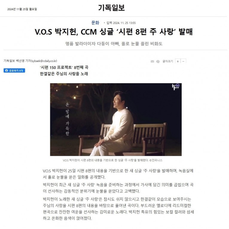 [기사] V.O.S 박지헌, CCM 싱글 ‘시편 8편 주 사랑’ 발매(기독일보)