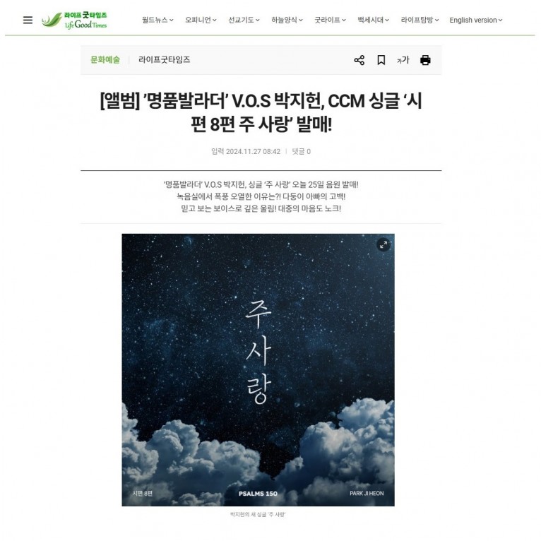 [기사] ’명품발라더’ V.O.S 박지헌, CCM 싱글 ‘시편 8편 주 사랑’ 발매!(라이프굿타임즈)