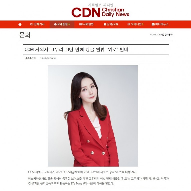 [기사] CCM 사역자 고우리, 3년 만에 싱글 앨범 ‘위로’ 발매(기독일보 씨디엔)