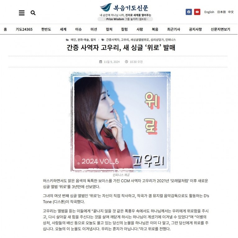[기사] 간증 사역자 고우리, 새 싱글 ‘위로’ 발매(복음기도신문)