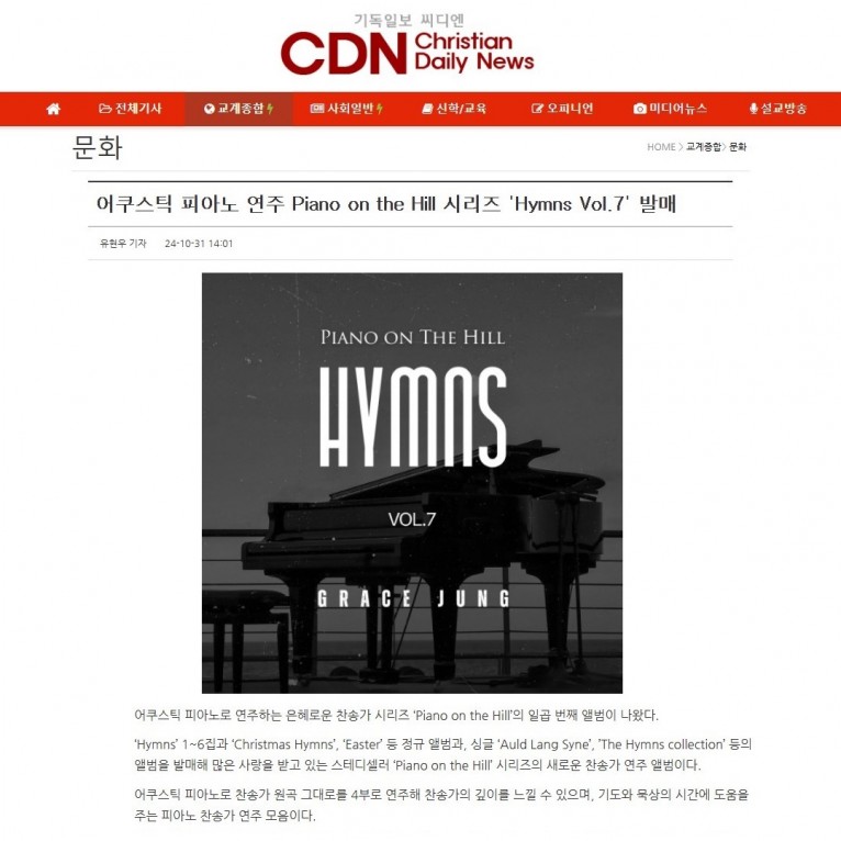 뮤직타임 [기사] 어쿠스틱 피아노 연주 Piano on the Hill 시리즈 'Hymns Vol.7' 발매(기독일보 씨디엔)