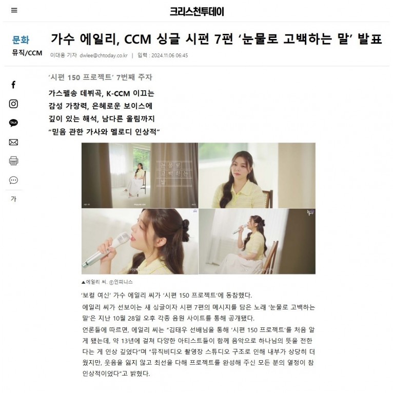 뮤직타임 [기사] 가수 에일리, CCM 싱글 시편 7편 ‘눈물로 고백하는 말’ 발표(크리스천투데이)