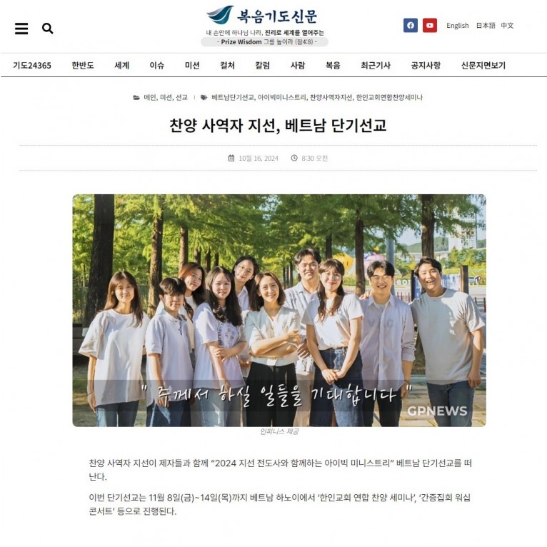 [기사] 찬양 사역자 지선, 베트남 단기선교(복음기도신문)