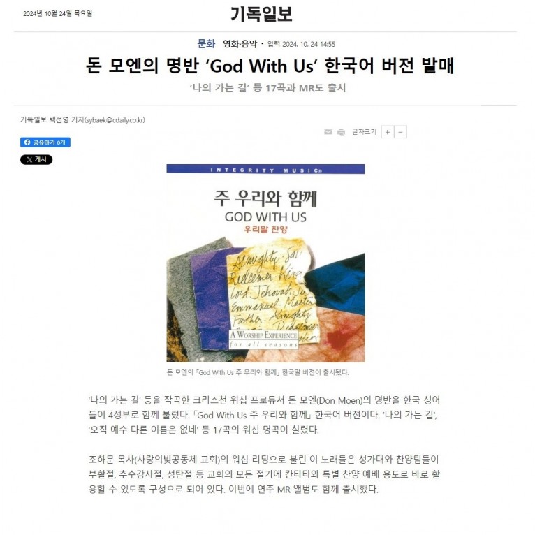 [기사] 돈 모엔의 명반 ‘God With Us’ 한국어 버전 발매(기독일보)