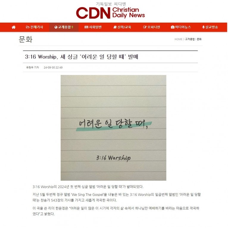 뮤직타임 [기사] 3:16 Worship, 새 싱글 ‘어려운 일 당할 때’ 발매(기독일보 씨디엔)
