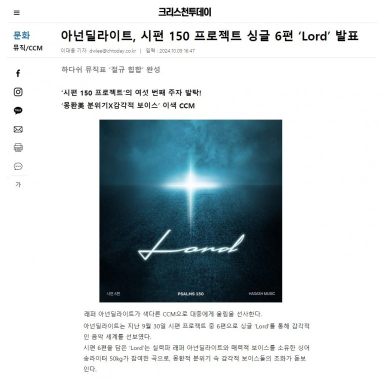 [기사] 아넌딜라이트, 시편 150 프로젝트 싱글 6편 ‘Lord’ 발표(크리스천투데이)