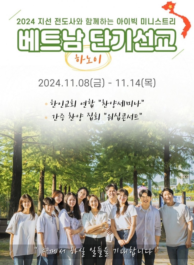 이번 단기선교는 11월 8일부터 14일까지 베트남 하노이에서 ‘한인교회 연합 찬양 세미나’, ‘간증집회 워십 콘서트’등의 행사를 포함해 진행되며, 특히 찬양 사역에 비전이 있는 현지 중고, 청장년층을 대상으로 하는 아이빅미니스트리의 이론 및 실전 세미나도 준비된다.