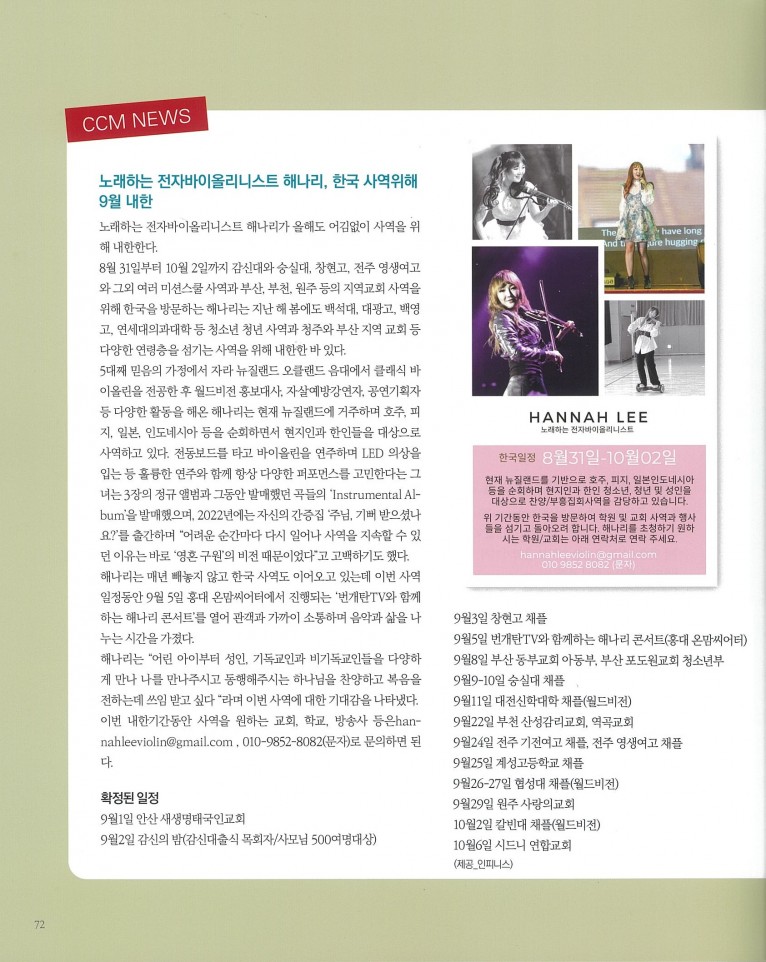 [잡지] CCM News_ 노래하는 전자바이올리니스트 해나리, 한국 사역위해 9월 내한 (월간 Church Media 2024.9월호)