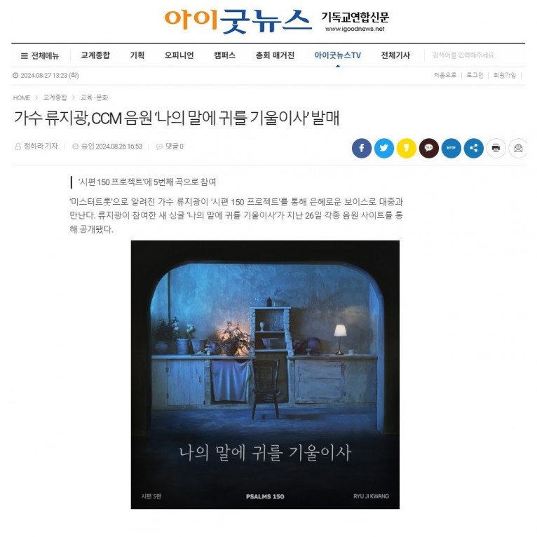 [기사] 가수 류지광, CCM 음원 ‘나의 말에 귀를 기울이사’ 발매(기독교연합신문)