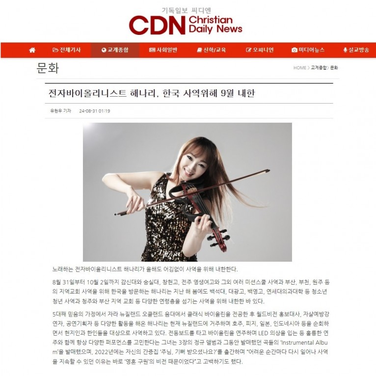 뮤직타임 [기사] 전자바이올리니스트 해나리, 한국 사역위해 9월 내한(기독일보 씨디엔)