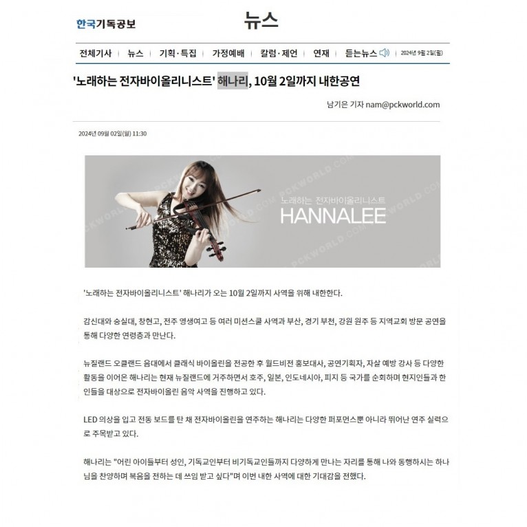 [기사] '노래하는 전자바이올리니스트' 해나리, 10월 2일까지 내한공연(한국기독공보)