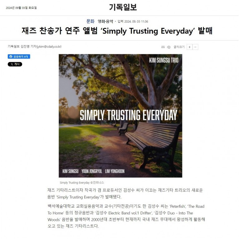 재즈 기타리스트이자 작곡가 겸 프로듀서인 김성수 씨가 이끄는 재즈기타 트리오의 새로운 음반 ‘Simply Trusting Everyday’가 발매됐다.