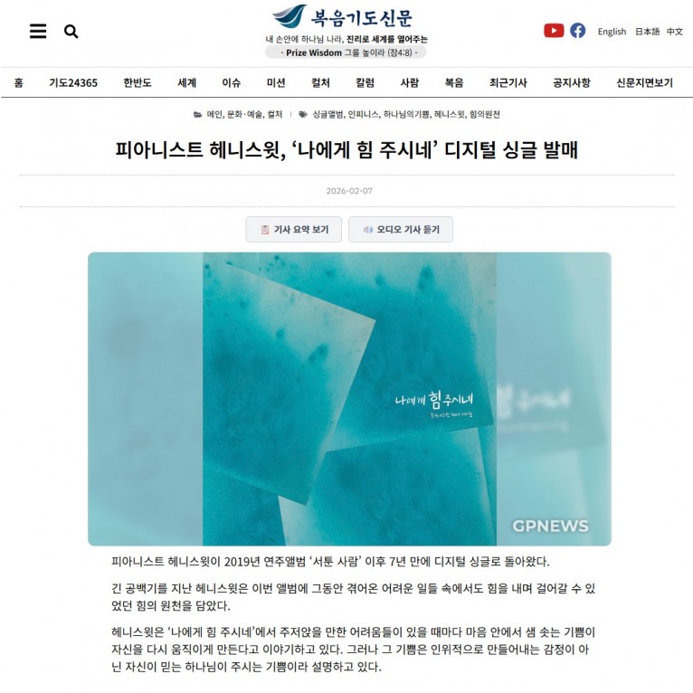 뮤직타임 [기사] 피아니스트 헤니스윗, ‘나에게 힘 주시네’ 디지털 싱글 발매(복음기도신문)