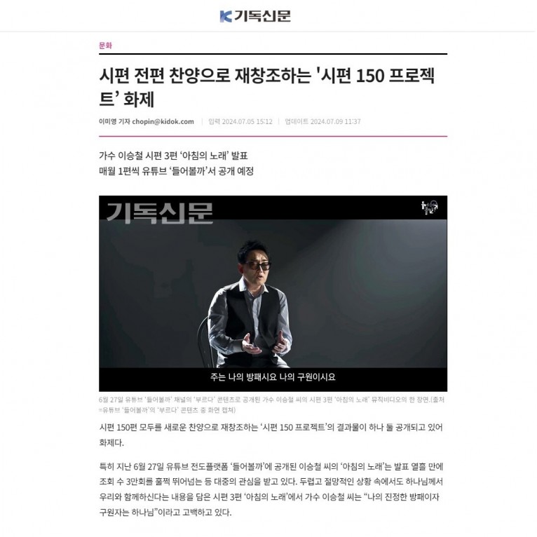 [기사] 시편 전편 찬양으로 재창조하는 '시편 150 프로젝트’ 화제(주간기독신문)