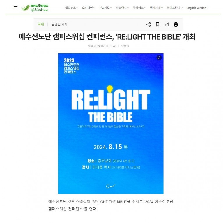 [기사] 예수전도단 캠퍼스워십 컨퍼런스, ‘RELIGHT:THE BIBLE‘ 개최(라이프굿타임즈)