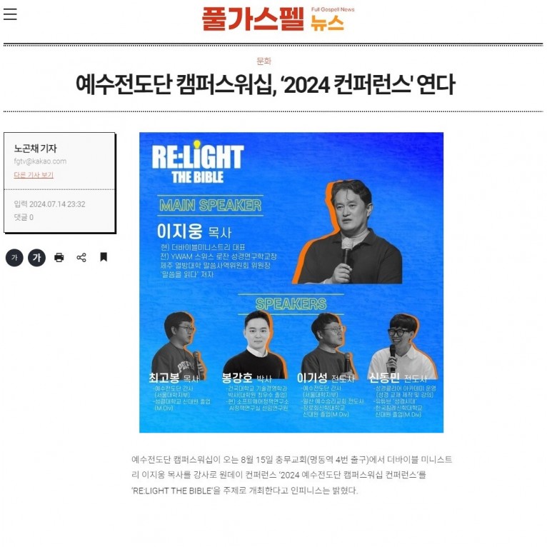 [기사] 예수전도단 캠퍼스워십, ‘2024 컨퍼런스' 연다(풀가스펠뉴스)