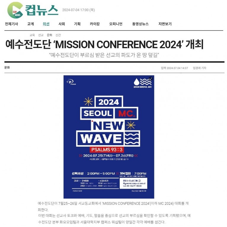 뮤직타임 [기사] 예수전도단 ‘MISSION CONFERENCE 2024’ 개최(크리스챤연합신문)