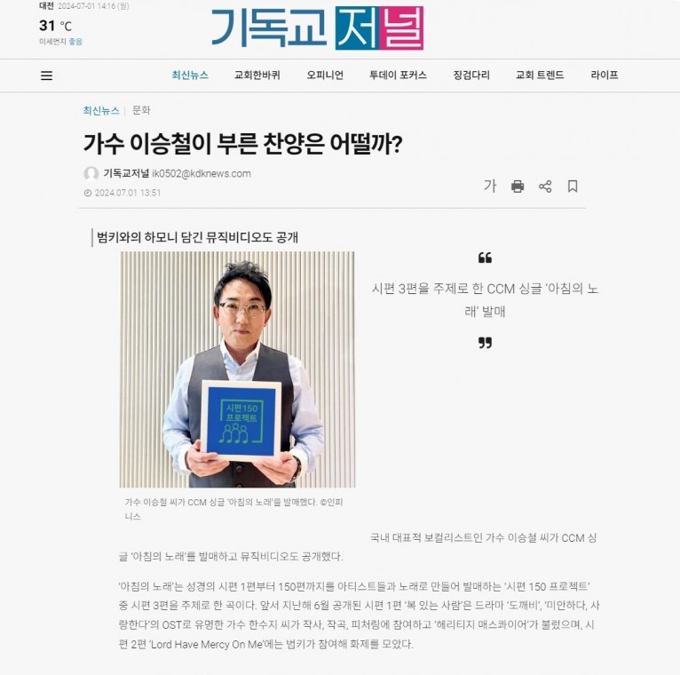 [기사] 가수 이승철이 부른 찬양은 어떨까(기독교저널)