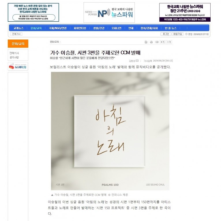 [기사] 가수 이승철, 시편 3편을 주제로한 CCM 발매(뉴스파워)