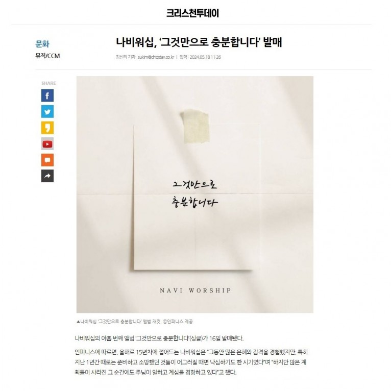 [기사] 나비워십, ‘그것만으로 충분합니다’ 발매 (크리스천투데이)