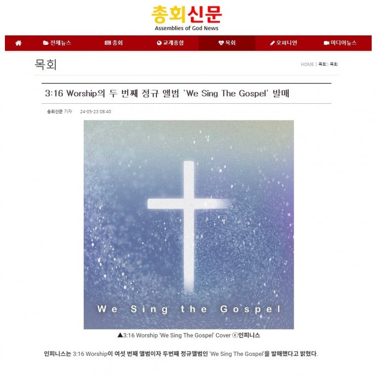 뮤직타임 [기사] 3:16 Worship의 두 번째 정규 앨범 'We Sing The Gospel' 발매(총회신문)