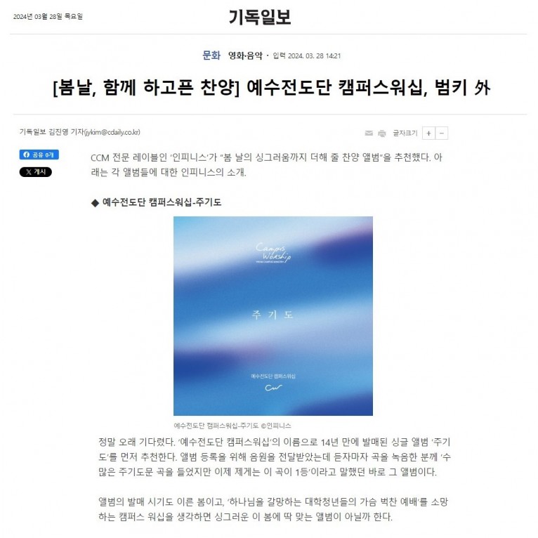 뮤직타임 [기획기사] [봄날, 함께 하고픈 찬양] 예수전도단 캠퍼스워십, 범키 外(기독일보)